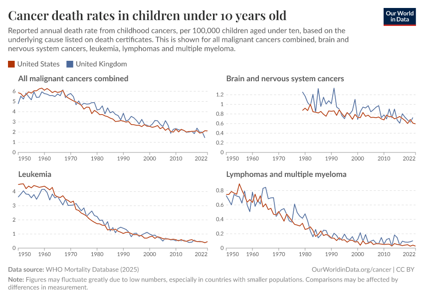 The chart below shows the decline in death rates for some common childhood cancers. You can see that childhood cancer death rates have declined greatly in the United States, especially for leukemias and lymphomas.