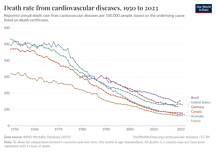 Saloni Dattani (2025) - “Death rates from cardiovascular disease have fallen dramatically — what were the breakthroughs behind this?” Published online at OurWorldinData.org. Retrieved from: 'https://country-profiles.owid.pages.dev/cardiovascular-deaths-decline' [Online Resource]BibTeX citation