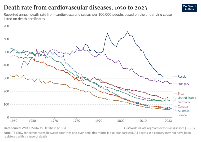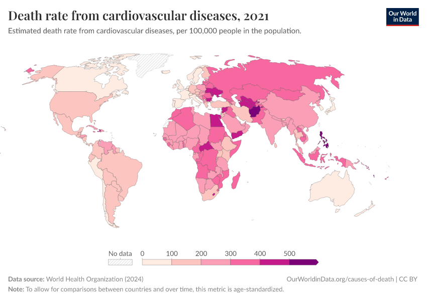 Saloni Dattani, Veronika Samborska, Hannah Ritchie, and Max Roser (2023) - “Cardiovascular Diseases” Published online at OurWorldinData.org. Retrieved from: 'https://country-profiles.owid.pages.dev/cardiovascular-diseases' [Online Resource]BibTeX citation