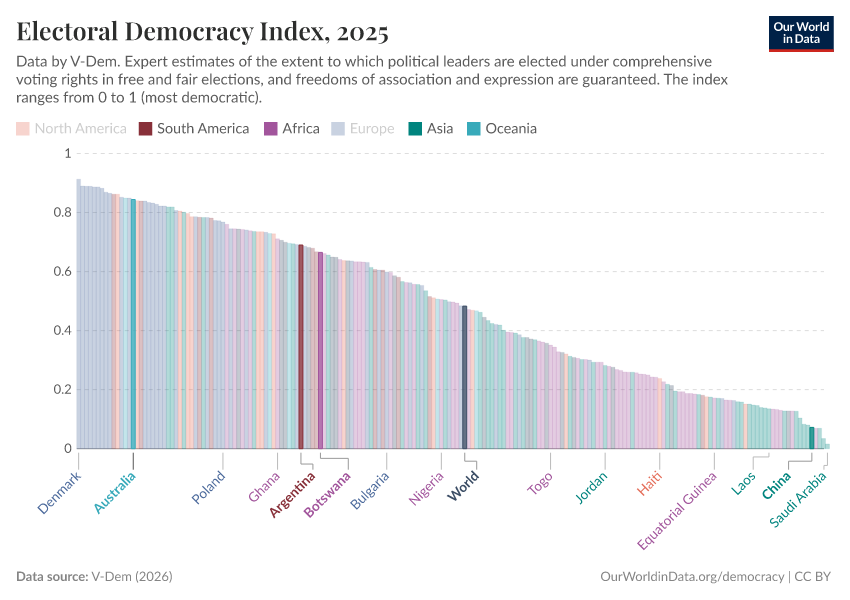 Bastian Herre, Lucas Rodés-Guirao, and Esteban Ortiz-Ospina (2013) - “Democracy” Published online at OurWorldinData.org. Retrieved from: 'https://country-profiles.owid.pages.dev/democracy' [Online Resource]BibTeX citation