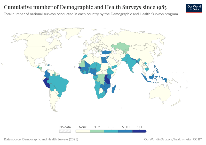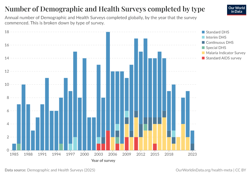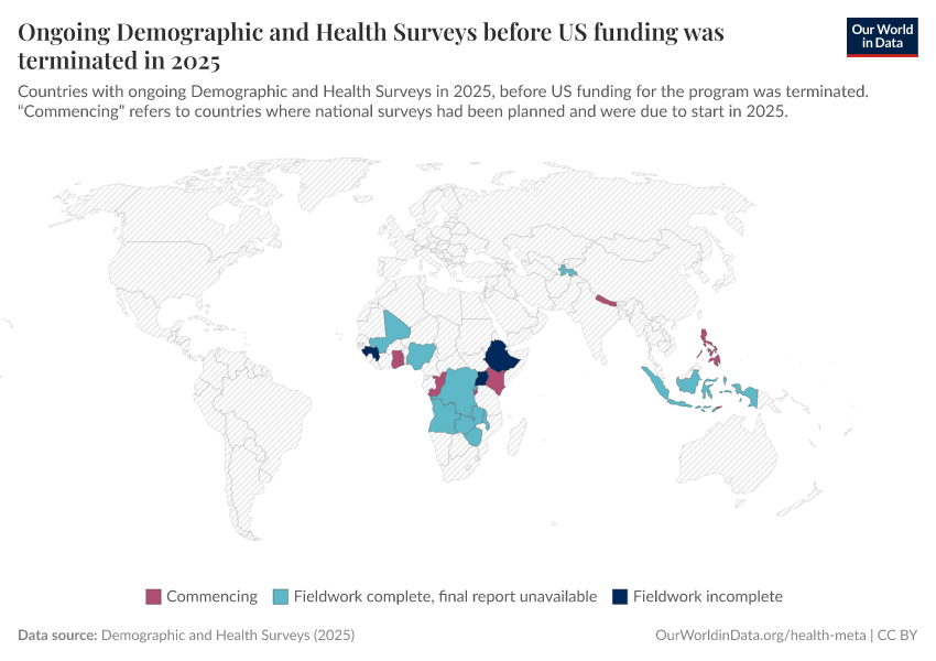 Saloni Dattani (2025) - “The Demographic and Health Surveys brought crucial data for more than 90 countries — without them, we risk darkness” Published online at OurWorldinData.org. Retrieved from: 'https://country-profiles.owid.pages.dev/demographic-health-surveys-risk' [Online Resource]BibTeX citation