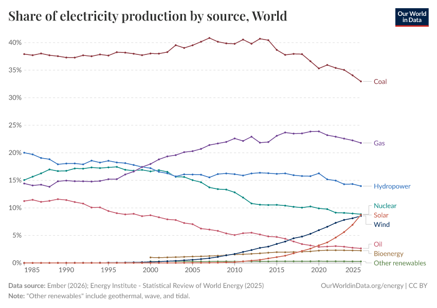 Globally, coal, followed by gas, is the largest source of electricity production. Of the low-carbon sources, hydropower and nuclear make the largest contribution; although wind and solar are growing quickly.