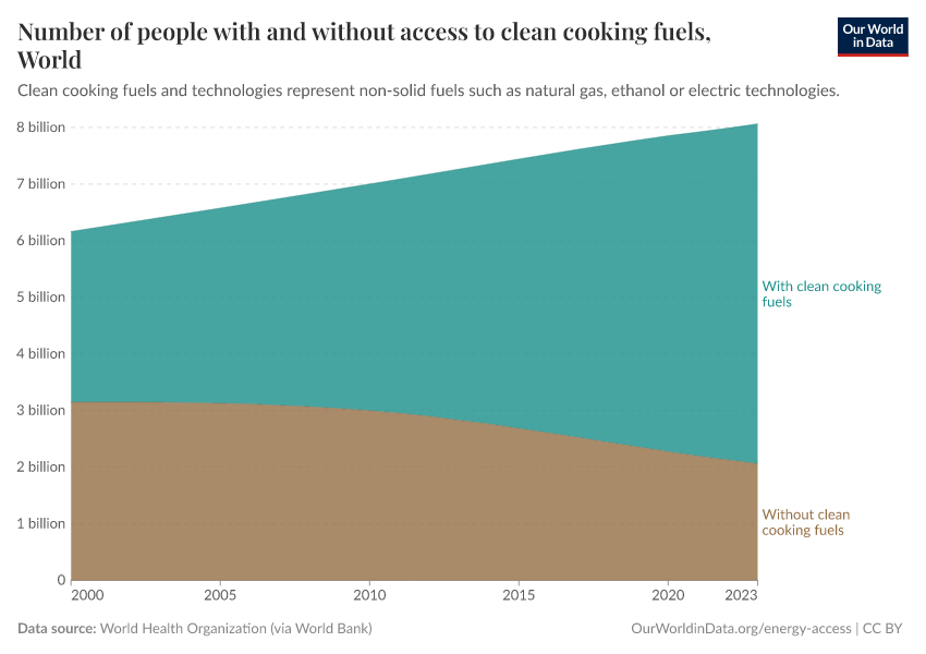 The total number of people globally without clean cooking fuels has slowly declined since 2000.