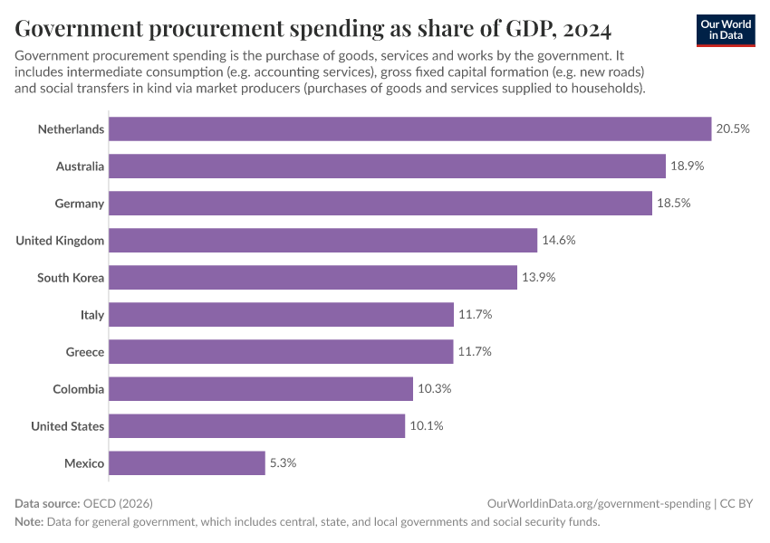 The chart shows the importance of public procurement in OECD countries (and partner countries providing comparable data). It shows the value of government spending on procurement as a share of GDP.