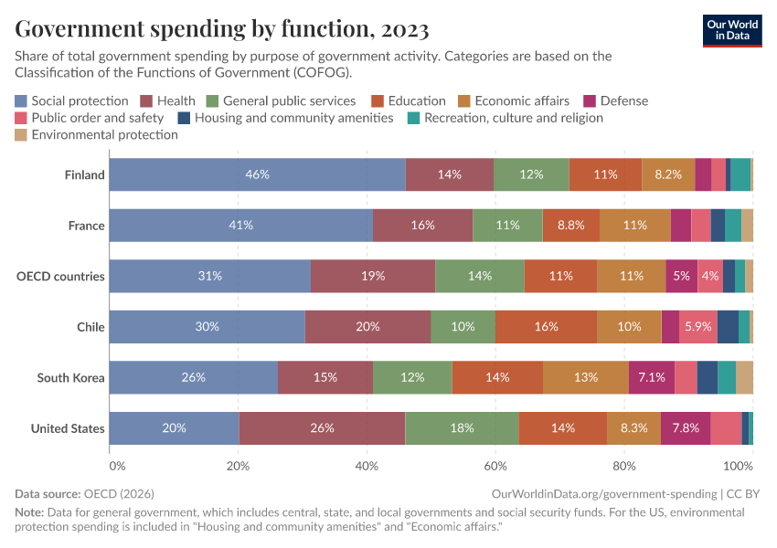 The chart shows how governments divide total spending across ten categories.1 You can also see spending in these categories as a share of GDP.
