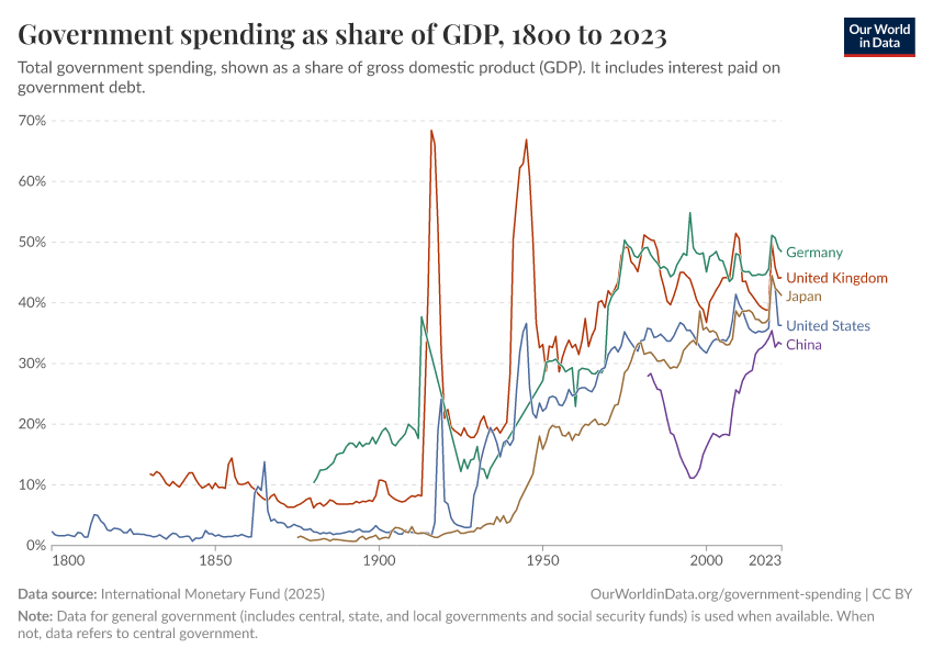 At the end of the 19th century, governments in European countries spent around 10% of their GDP. In the 21st century, this figure is closer to 50% in many European countries. The increase in absolute terms — rather than the shown relative terms — is much larger since the level of GDP per capita increased substantially over this period.