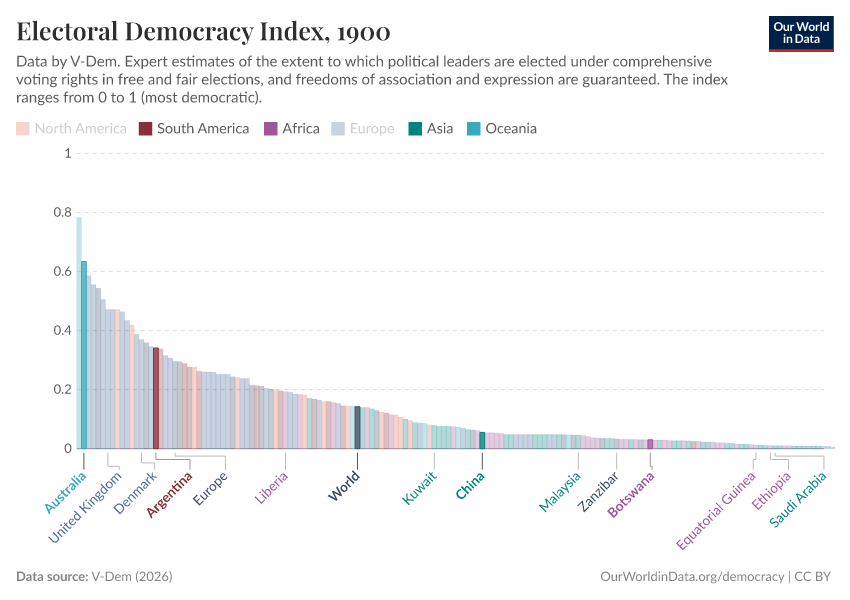 “Data Page: Electoral democracy index”, part of the following publication: Bastian Herre, Lucas Rodés-Guirao, and Esteban Ortiz-Ospina (2013) - “Democracy”. Data adapted from V-Dem. Retrieved from https://country-profiles.owid.pages.dev/grapher/electoral-democracy-index [online resource]How to cite this data