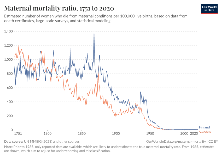 WHO, UNICEF, UNFPA, World Bank Group and UNDESA (2025); WHO Mortality Database (2025); UN, World Population Prospects (2024); Gapminder (2010) – with major processing by Our World in Data. “Maternal mortality ratio” [dataset]. WHO, UNICEF, UNFPA, World Bank Group and UNDESA/Population Division, “Trends in maternal mortality 2025”; WHO Mortality Database, “WHO Mortality Database”; United Nations, “World Population Prospects”; Gapminder, “Maternal mortality ratio V1” [original data]. Retrieved December 19, 2025 from https://country-profiles.owid.pages.dev/grapher/maternal-mortality