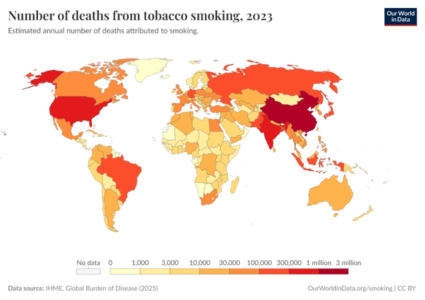 “Data Page: Number of deaths from tobacco smoking”, part of the following publication: Esteban Ortiz-Ospina and Max Roser (2016) - “Global Health”. Data adapted from IHME, Global Burden of Disease. Retrieved from https://country-profiles.owid.pages.dev/grapher/number-of-deaths-from-tobacco-smoking [online resource]How to cite this data