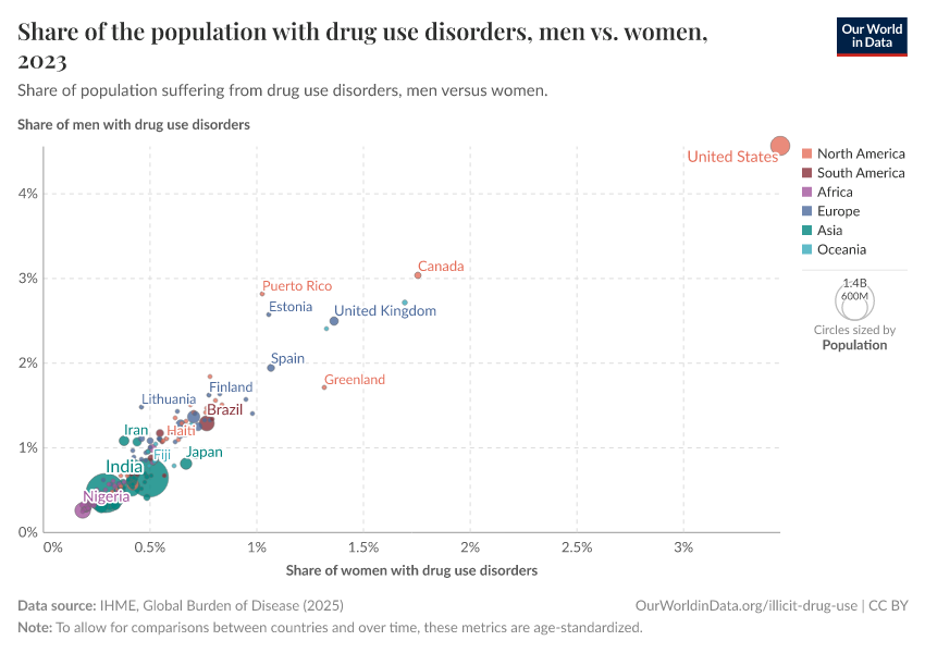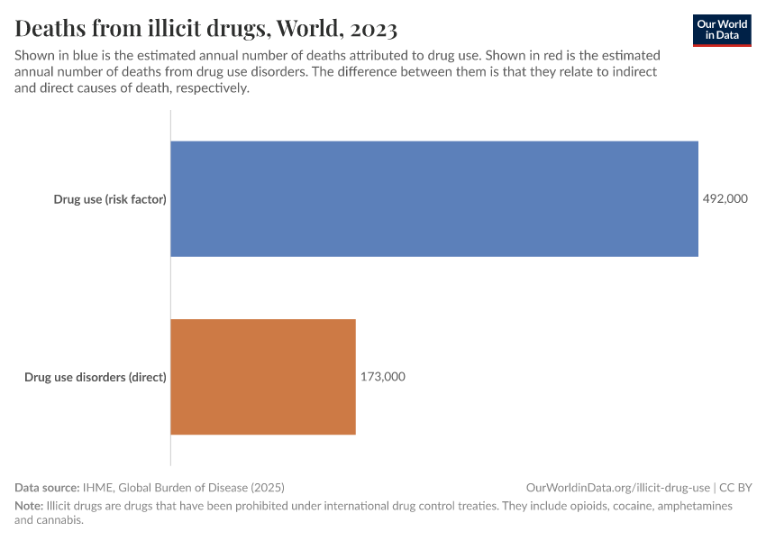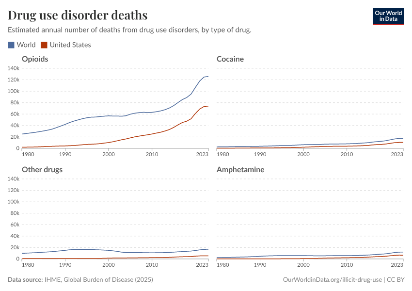 Hannah Ritchie, Pablo Arriagada, and Max Roser (2022) - “Opioids, Cocaine, Cannabis, and Other Illicit Drugs” Published online at OurWorldinData.org. Retrieved from: 'https://country-profiles.owid.pages.dev/illicit-drug-use' [Online Resource]BibTeX citation