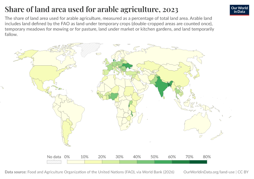 There are two main uses of agricultural land: arable farming (which is land dedicated to growing crops) and pastureland (which includes meadows and pastures used for livestock rearing). In the chart here we see a global map of land used for arable agriculture (as a share of total land area).