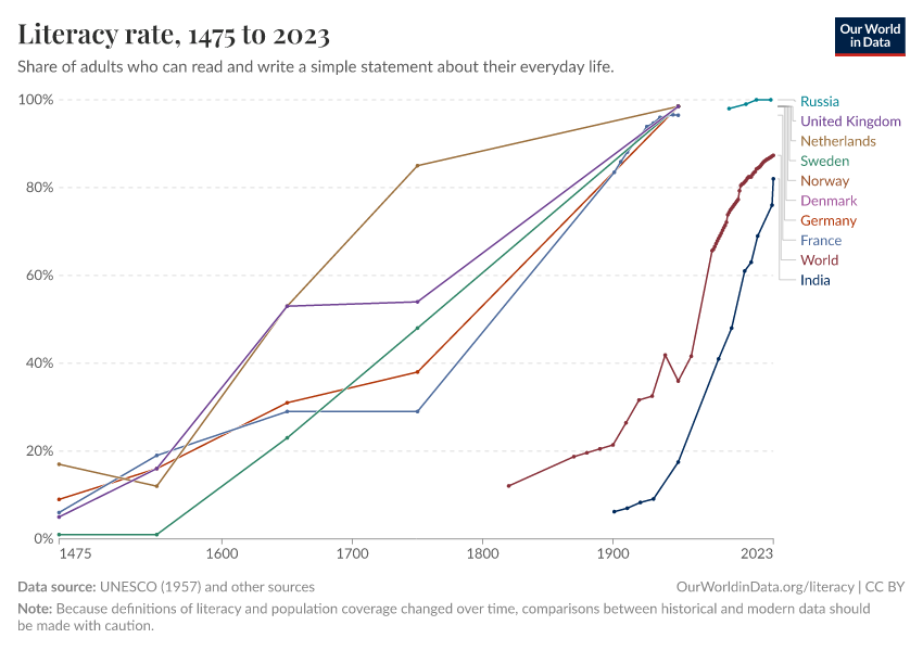 In many countries, more than 95% have basic literacy skills. Literacy skills of the majority of the population are a modern achievement as we show below.