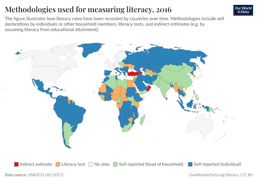 Here, we can see that most countries use sampling instruments (coded as 'Survey' on the map), although in the past census data was more common. Literacy surveys have the potential of being more accurate – when the sampling is done correctly – because they allow for more specific and detailed measurement than short and generic questions in population censuses.