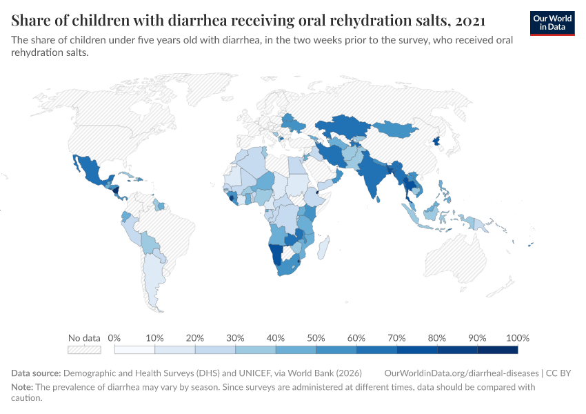 The map below shows the share of children under the age of 5 who received diarrheal treatment in the form of oral rehydration salts.