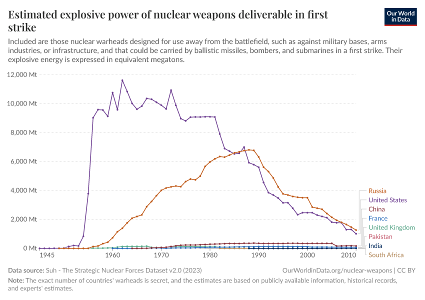 The data shown in the following chart attempts to take this into account. It considers the destructiveness and deployment of nuclear warheads to arrive at an estimate of the explosive power of nuclear weapons deliverable in a first strike.