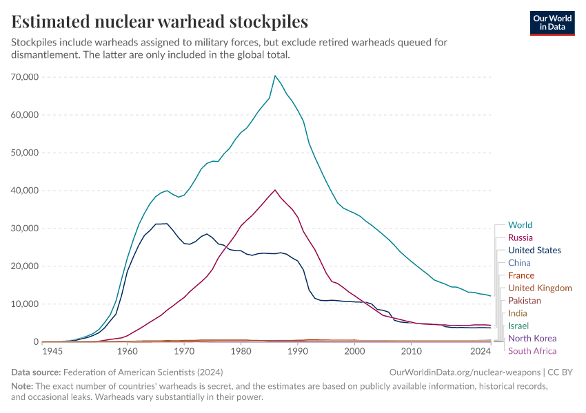 Bastian Herre, Pablo Rosado, and Max Roser (2024) - “Nuclear Weapons” Published online at OurWorldinData.org. Retrieved from: 'https://country-profiles.owid.pages.dev/nuclear-weapons' [Online Resource]BibTeX citation