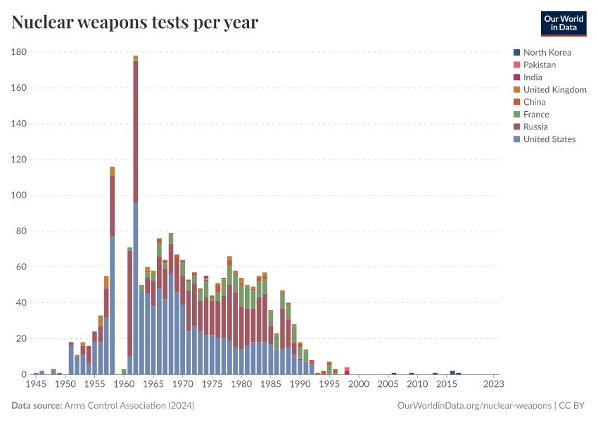 Tests decreased later during the Cold War and have been nearly absent in the last two decades. The only country that has recently tested nuclear weapons is North Korea.