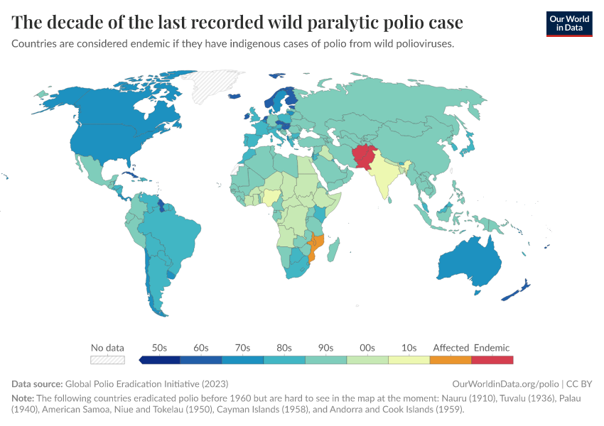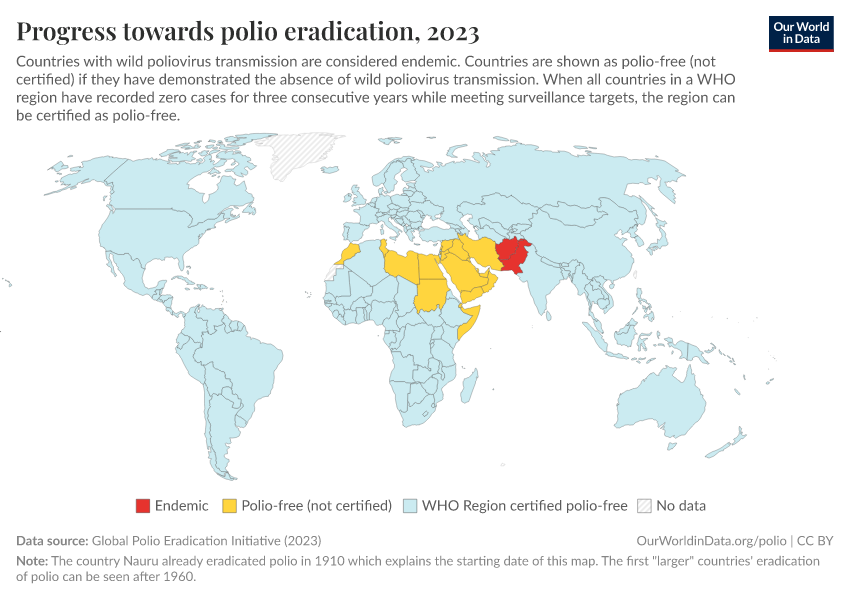 Saloni Dattani, Fiona Spooner, Sophie Ochmann, and Max Roser (2022) - “Polio” Published online at OurWorldinData.org. Retrieved from: 'https://country-profiles.owid.pages.dev/polio' [Online Resource]BibTeX citation