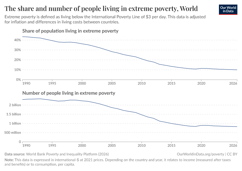 According to World Bank estimates, in 1990, there were 2.31 billion people living in extreme poverty. By 2025, that number had fallen to 808 million. The average fall over the 35 years in between is: (2.31 billion – 0.808 billion)/35 = 42.9 million. Dividing by the number of days (35 x 365) gives the average daily fall: (2.31 billion – 0.808 billion)/(35 x 365) = 118,000. (All figures rounded to 3 significant figures).