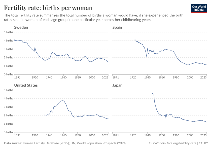 Saloni Dattani and Lucas Rodés-Guirao (2025) - “Why the total fertility rate doesn’t necessarily tell us the number of births women eventually have” Published online at OurWorldinData.org. Retrieved from: 'https://country-profiles.owid.pages.dev/total-fertility-rate-births-per-woman' [Online Resource]BibTeX citation
