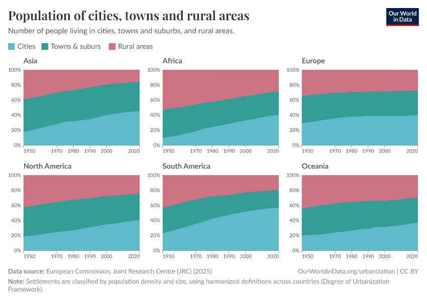 However, the manual on how to apply the Degree of Urbanization recommends reporting figures across three distinct categories—cities, towns, and villages—rather than using a simple urban-rural dichotomy. This approach recognizes urbanization as a continuum, acknowledging that towns occupy a unique position, differing significantly from both cities and villages in their characteristics and needs. The reported cities, and towns population shares by continent are shown in the chart below.