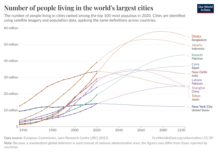 According to the European Commission, Guangzhou — a city in China — was the most populous city in the world, with over 40 million inhabitants. Back in 1975, its population was just over 2 million. Dhaka (the capital of Bangladesh) increased from less than 5 million in 1975 to over 33 million in 2020 (and is projected to reach more than 40 million by 2035).