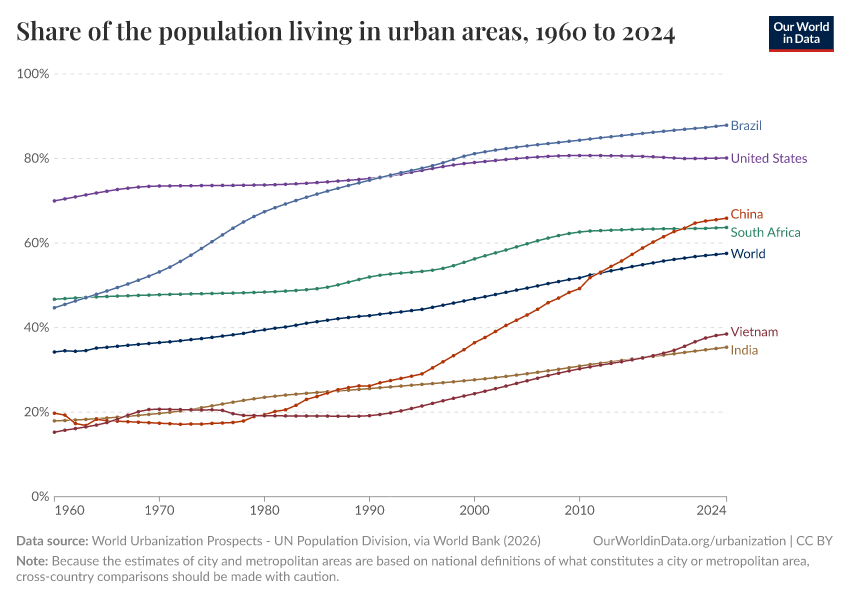 Hannah Ritchie, Veronika Samborska, and Max Roser (2024) - “Urbanization” Published online at OurWorldinData.org. Retrieved from: 'https://country-profiles.owid.pages.dev/urbanization' [Online Resource]BibTeX citation